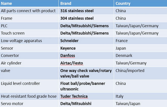3. Allir íhlutirnir sem komast í snertingu við framleiðslu eru úr 316 L ryðfríu stáli sem er flutt inn og unnið með CNC vélum.